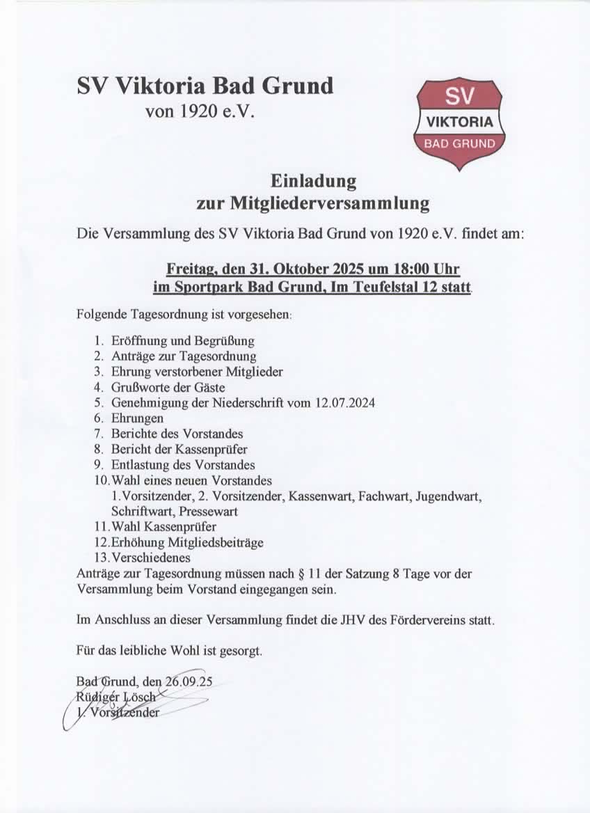 Die diesjährige Mitgliederversammlung des SV Viktoria findet am Freitag, den 31.10.25 um 18.00 Uhr im Vereinsheim statt.