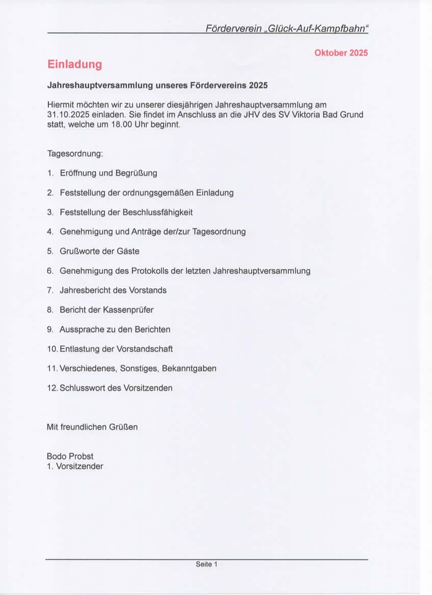 Im Anschluß dieser Veranstaltung lädt auch der Vorstand des Fördervereins Glück-Auf Kampfbahn Bad Grund zu seiner Jahreshauptversammlung ein.